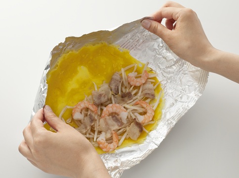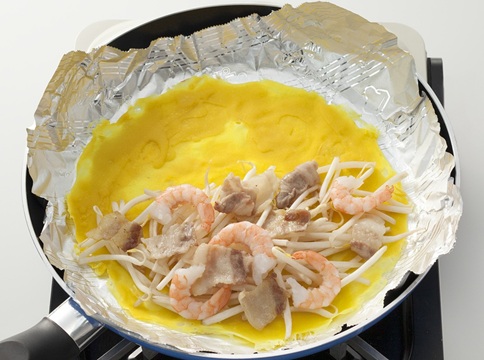 大きめのフライパンに「クックパー®フライパン用ホイル(30cm幅)」を敷き、(4)の生地の1/4量を薄く流す。もやし、豚肉、むきエビのそれぞれ1/4量を入れ、ふたをして約2分蒸し焼きにする。