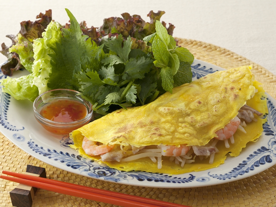 ・米粉を使ったベトナム風お好み焼き。「バイン」はパンや餅の意味。「セオ」は焼く時のジュージューという擬音語です。