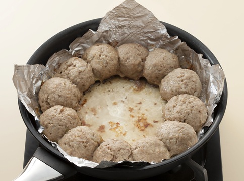 「クックパー®フライパン用ホイル」を敷いたフライパンに、(4)をリング状に並べて中火でふたを閉めて2~3分焼き、弱火に落としてさらに5~7分じっくりと焼く。竹串を刺して透き通った肉汁が出てきたら火を止め、肉汁が落ち着くまで5~10分おく。