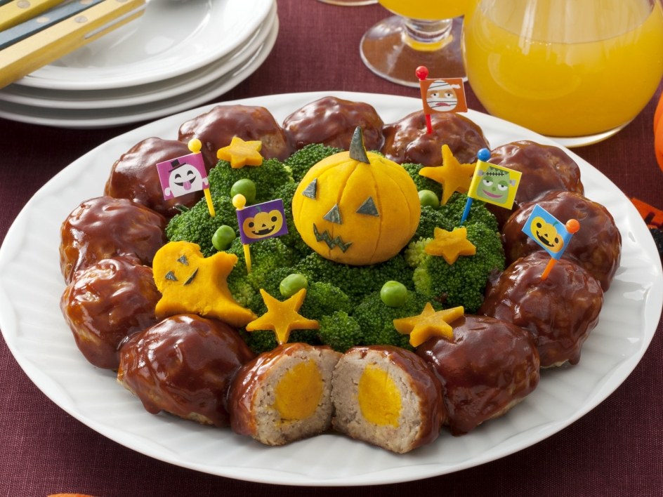 皿から「フライパン用ホイル」を引き抜き、肉にソースをかけ、リングの真ん中にブロッコリーを盛り、型で抜いたかぼちゃなどでデコレーションする。