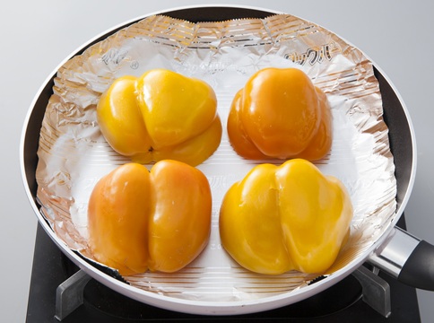 パプリカは縦半分に切り、種を除く。耐熱皿にのせ、「サランラップ®」でゆったりとふたをし電子レンジで約4分加熱し、冷ましておく。