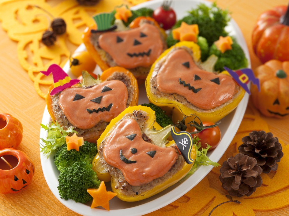 ジャックオーランタンの顔に見立てた楽しいハンバーグです。パプリカはずんぐりした形のものを選びましょう。