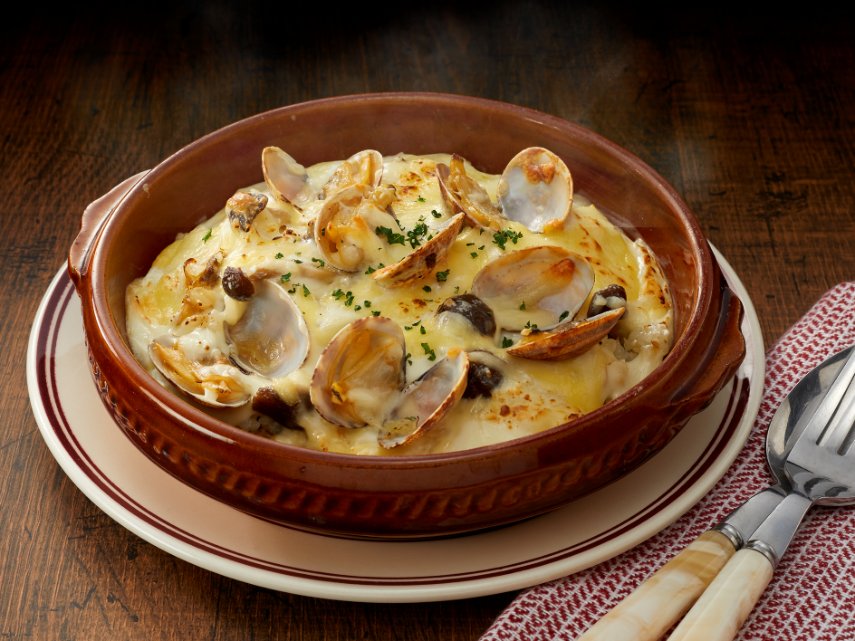 グラタン皿に(3)を敷き、殻つきの残りのアサリをのせる。残りの蒸し汁をホワイトソースに混ぜてかけ、ピザ用チーズをのせる。オーブントースターで焦げ目がつくまで焼き、パセリを散らす。