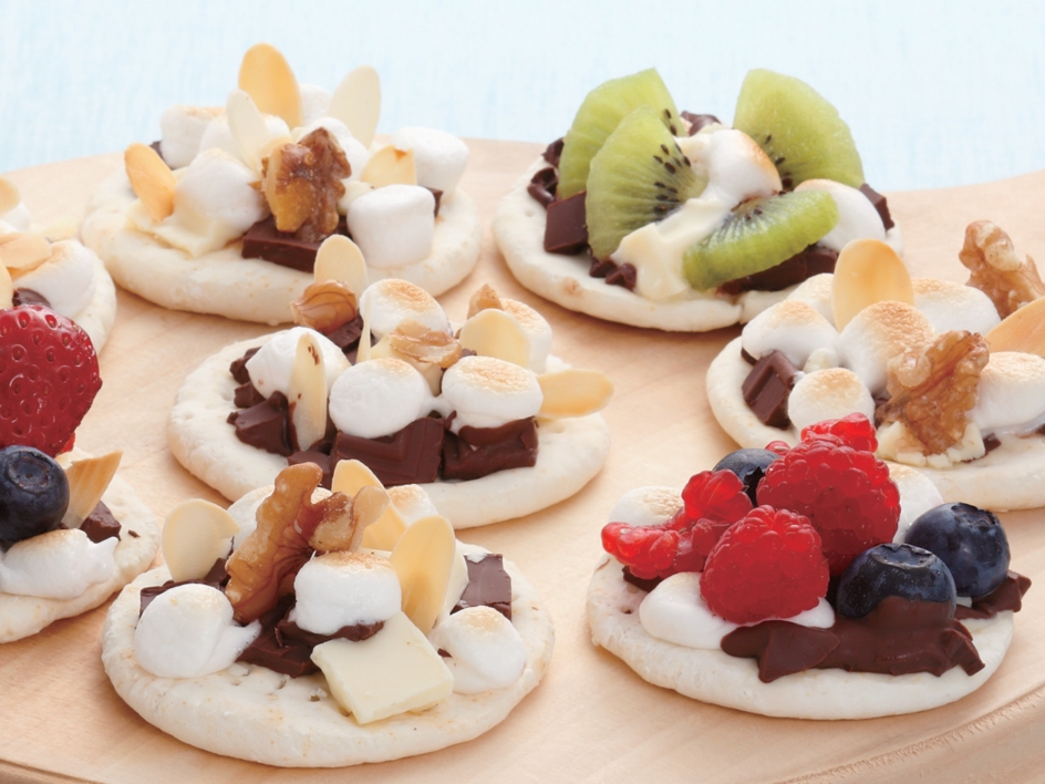 (3)の生地にあらく刻んだミルクチョコレートとホワイトチョコレート、マシュマロを適量のせ、マシュマロに軽く焦げ色がつくまでさらに1~2分焼く。ローストしたアーモンドをふる。