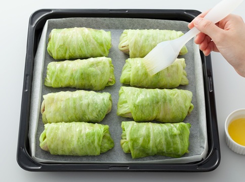 箱型に折った「クックパー®クッキングシート」をオーブンの天板にのせ(3)をとじ目を下にして並べる。Bのバターが熱いうちに砂糖を混ぜ、はけでロールキャベツの表面に塗る。210℃に予熱した電気オーブンで約25分(ガスオーブンの場合は200℃に予熱し同時間)、上面に焼き色がつくまで焼く。