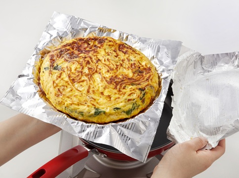 よい焼き色がついて周囲がかたまってきたら火を止める。ふたを取り、別の「フライパン用ホイル」を、食品をのせる面を下にしてかぶせる。ふたでおさえながらフライパンごとひっくり返し、中身をふたの裏に取り出す。「フライパン用ホイル」ごと、すべらせるようにしてフライパンに戻し、焼けていない方の面を、さらに2分ほど焼く。
