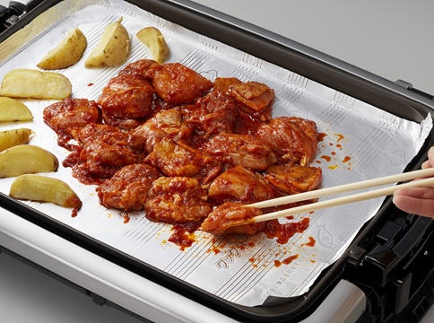 ホットプレートに「クックパー®フライパン用ホイル」を敷き、予熱する。プレートが温まったら、皮つきのままくし切りにした(2)を並べ、(1)をたれごと広げる。ふたをして3分ほど焼き、肉とじゃがいもを裏返し、(3)を全体に広げ、再度ふたをして2分焼く。