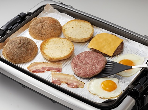 ホットプレートに「クックパー®フライパン用ホイル」を敷き、予熱する。プレートが温まったら、(1)の両面に塩、こしょうをふってのせ、焼き始める。あいたスペースで目玉焼き、半分に切ったベーコン、半分に切ったパンを焼く。目玉焼きには軽く塩、こしょうをふる。