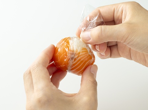 「サランラップ®」を15×15cm程度に切り、サーモンを置く。その上にボール状のすし飯を1個のせ、「サランラップ®」で茶巾のように絞って、丸く成形する。「サランラップ®」をはずし、ジャックオーランタンの顔のパーツに切ったのりをのせる。