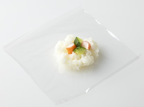 同様に、「サランラップ®」を切り、すし飯1個をのせ、中心に1cm程度に切ったカニ風味かまぼこと、さいころ状に切ったきゅうりを適量入れ、成形する。手まりずしの上部にマヨネーズを適量しぼり、薄焼き卵をおばけに見立ててかぶせる。目や口のパーツに切ったスライスチーズとのりをマヨネーズで貼りつける。