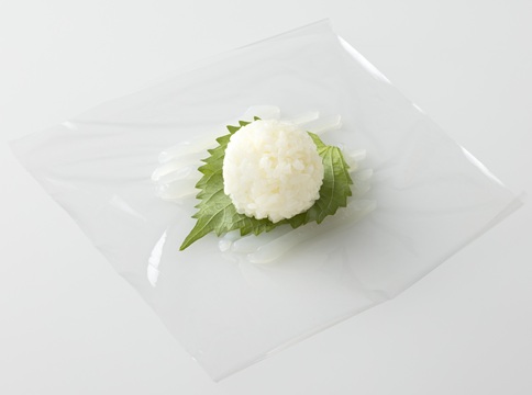 同様に、「サランラップ®」を切り、いかそうめんを目になる部分が空くようにのせる。軸をとった青じそ、すし飯1個を順にのせて成形する。スライスチーズとのりで作った目のパーツをのせる。