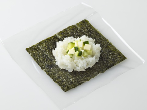 同様に、「サランラップ®」を切り、全形を4等分にしたのりを1枚、すし飯1個を順にのせ、中心に5mm角に切ったスライスチーズときゅうりを適量入れ、成形する。「サランラップ®」をはずし、ネコの顔や耳のパーツに切ったスライスチーズとのりをのせる。