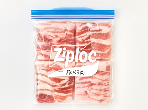 豚肉は食べやすい大きさに切って「サランラップ®」で包み、「ジップロック®フリーザーバッグ(M)」に入れ、なるべく空気を抜いてジッパーを閉め、冷凍保存。