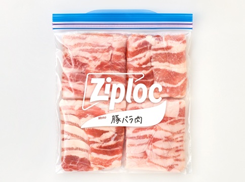 豚肉は食べやすい大きさに切って「サランラップ®」で包み、「ジップロック®フリーザーバッグ(M)」に入れ、なるべく空気を抜いてジッパーを閉め、冷凍保存。