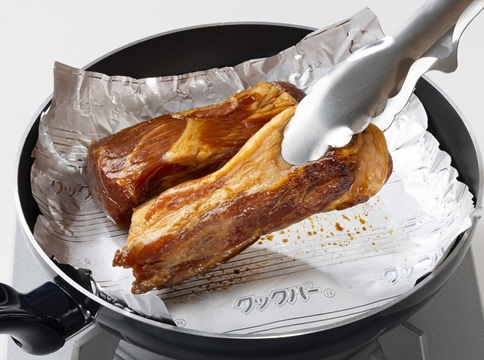 「クックパー®フライパン用ホイル」を敷いたフライパンにたれをきった(2)を並べ、弱めの中火で表面を焦がさないように焼き、ふたをして弱火でときどき焼き面を入れかえながら、中心に火が通るまでじっくりと焼く。