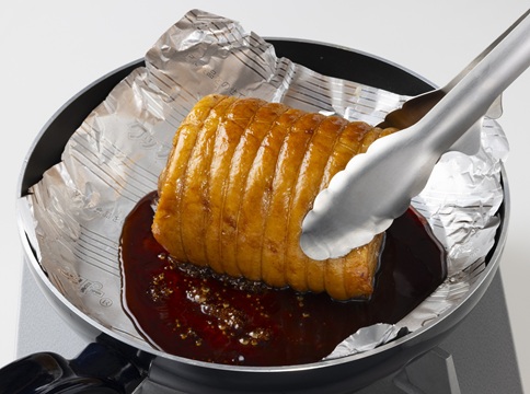 「フライパン用ホイル」が熱くないことを確認してホイルごと取り出し、出た脂を除き、ホイルをフライパンに戻す。Aを加えて中火にかけ、(3)の肉を戻し、2分ほど中火でからめながら煮る。