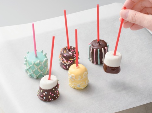 マシュマロをピックに刺し、スプーンなどで(1)をかけ、「クッキングシート」を敷いたバットにのせ、すぐにトッピング材料でデコレーションする。