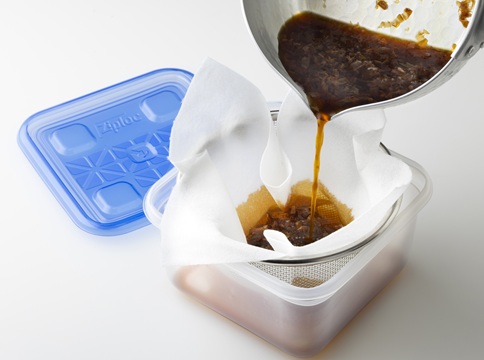 小鍋にAを入れてひと煮立ちさせ、「クッキングペーパー」を広げたざるを「ジップロック®コンテナー(正方形1100ml)」にのせて、こす。