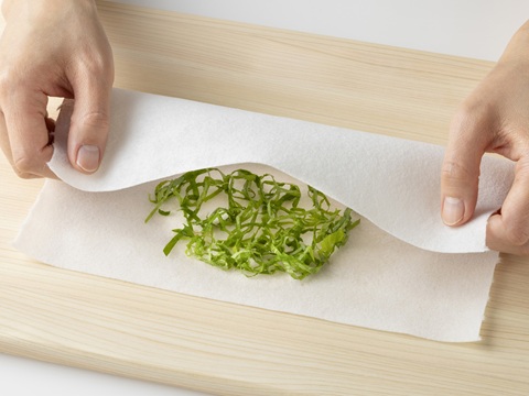 大根はすりおろして「クッキングペーパー」で包み、軽く水けをきる。青じそはせん切りにして「クッキングペーパー」に包み、水にさらしてから、水けをしっかりと絞る。