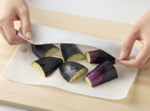 なすはヘタをとって縦半分に切り、皮に斜めに細かく切れ目を入れ、食べやすい大きさに切る。水にさらしてアクを抜き、「リード クッキングペーパー」で水けをよくふき取る。