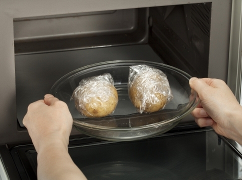 じゃがいもは洗って1つずつ「サランラップ®」でゆったりと包み、電子レンジ(500W)で約5分、竹串がスッと通るまで加熱する。熱いうちに皮をむき、つぶしておく。