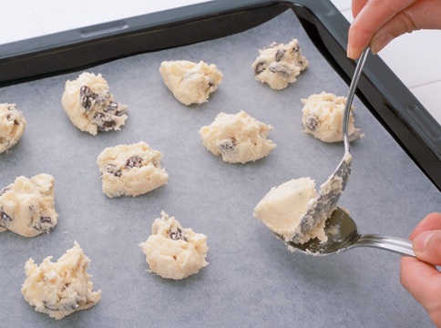 「クックパー®クッキングシート」を敷いた天板に(3)の生地をスプーンですくい、別のスプーンで押し出すようにして落とす。