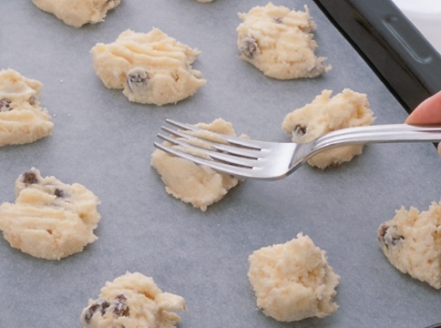水をつけたフォークの背で押さえ、ホワイトチョコチップとラムレーズンを飾り、180℃に予熱した電気オーブンで12~15分(ガスオーブンの場合は170℃に予熱して同時間)焼く。焼き上がったら、金網などにのせて冷ます。