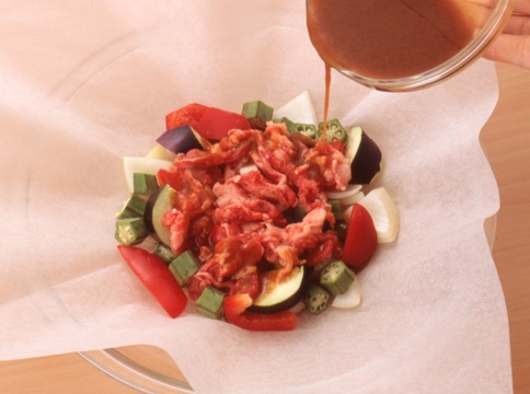「クックパー®クッキングシート(L)」を30cmの正方形に切り、対角線に折ってから耐熱皿に広げ、中央に(1)の野菜、牛肉の順にのせ、合わせたAをまわしかける。