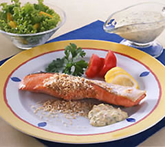 皿にサケを盛りつけ、(1)をかけて、粗みじん切りにしたゆで卵を加えたタルタルソースを添える。