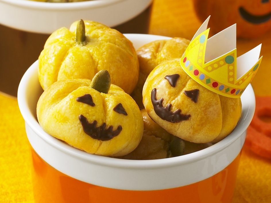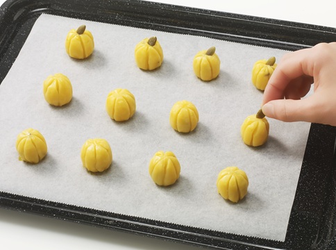 (2)を12等分し、それぞれパンプキンシードを3~4粒包んで丸める。竹串などで周囲に6本筋をつけ、上部を軽く押さえる。「クックパー®クッキングシート」を敷いた天板に並べ、Aを混ぜ合わせた卵液を表面に塗り、ヘタに見立てたパンプキンシードを飾る。