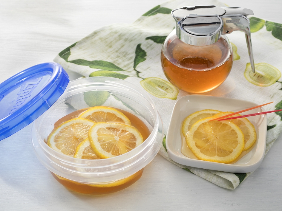 「ジップロック®スクリューロック®(300ml)」にレモンとはちみつを交互に入れ、フタを閉めて冷蔵室で30分ほどおき、レモンから汁けが出てきたら、容器をなるべく水平にして揺すり、はちみつを行きわたらせる。さらに冷蔵室で2~3時間漬け込む。